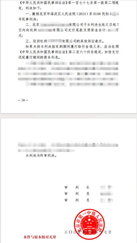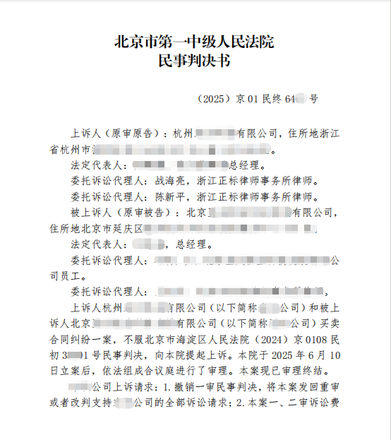 终于,在委托人积极配合与信任,正标律师团队成员密切协作,以及审理法官团队广开言路的共同努力下,北京市第一中级人民法院于2025年6月27日做出二审终审判决,撤销海淀区人民法院一审判决,改判支持了我方公司主张剩余全部货款的诉讼请求,充分保障了委托人公司的合法权益。
