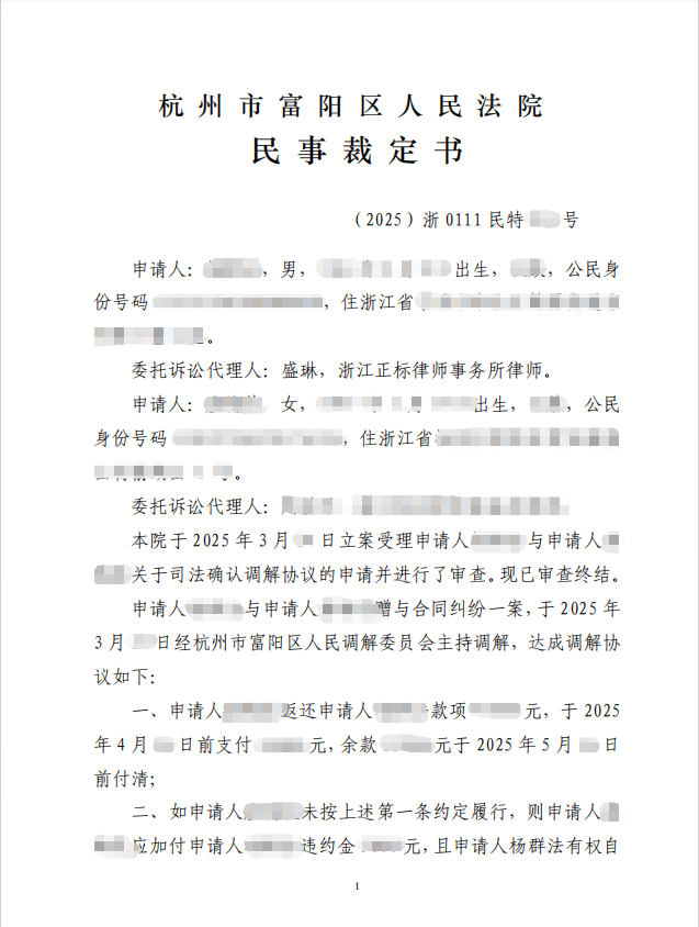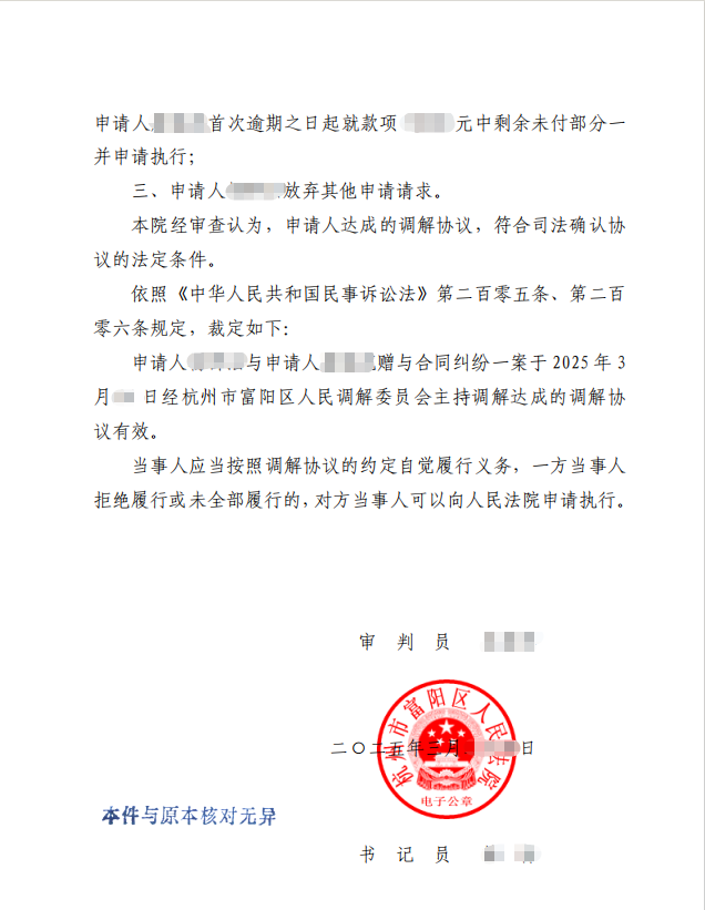 本案中,原告律师充分发挥专业优势,围绕“以结婚为目的的附条件赠与”核心法律点,明确原告权益主张的合法性与合理性,积极推动调解进程。通过与对方及调解机构的有效沟通,在较短时间内促成调解协议达成,不仅为当事人争取到明确的返还金额及履约保障(含逾期违约金条款),更通过司法确认赋予协议强制执行力,确保权益落地。
