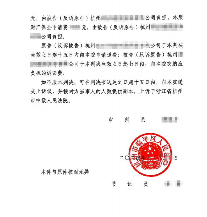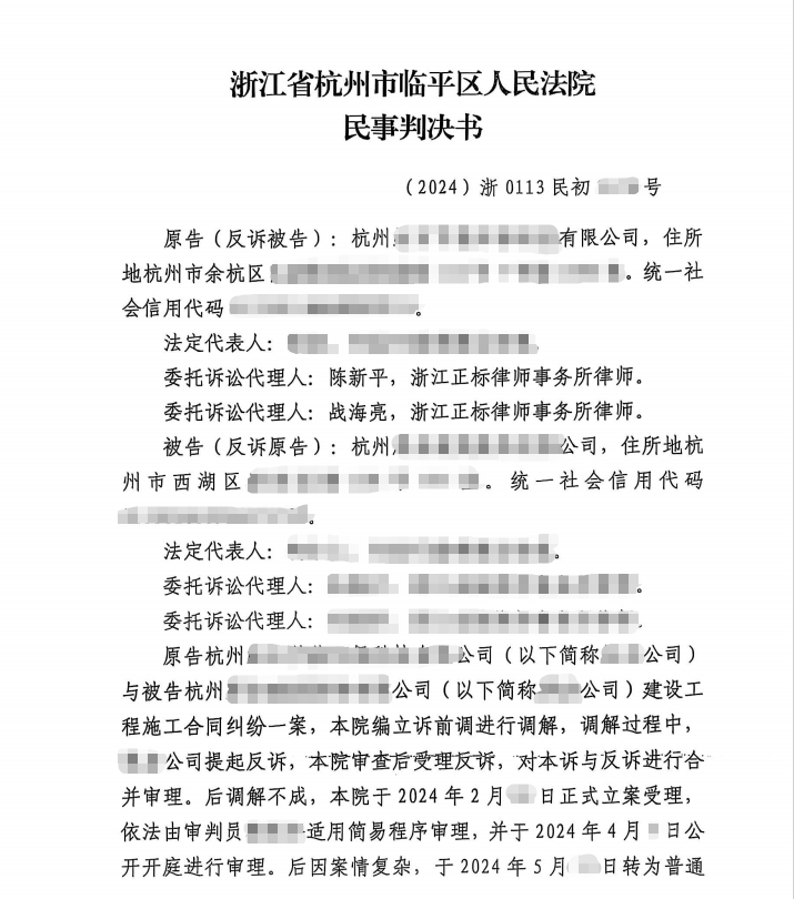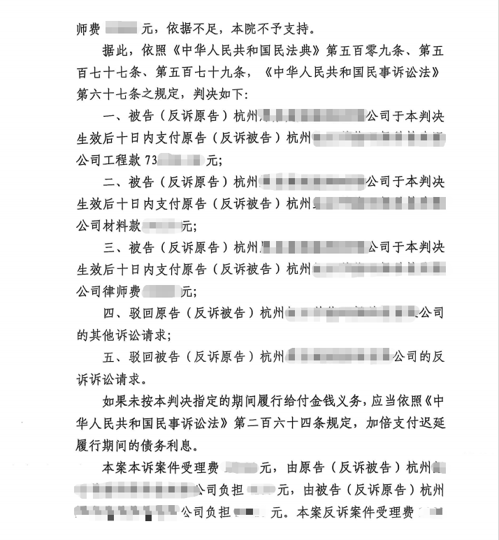 经杭州市临平区人民法院一审判决,判决支付工程款73万余元、材料款以及律师费;反诉全部驳回——对方索赔12万元被依法否决!