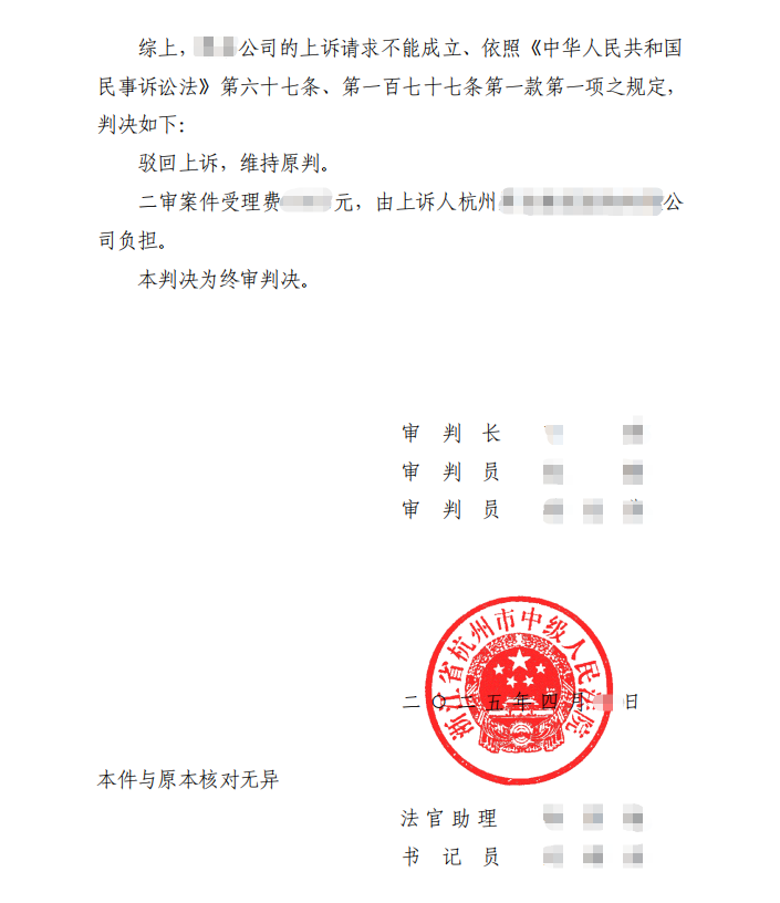 一审判决下达后,被告B公司不服,提起上诉,后二审法院驳回上诉,维持原判。我方当事人取得最终胜利!