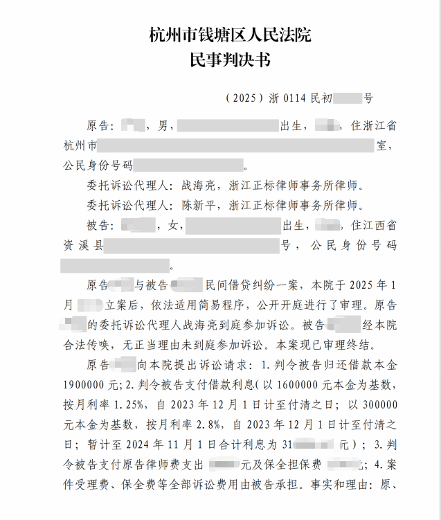 2025年5月,经杭州市钱塘区人民法院一审判决,全额追回本金+利息及维权成本,本案取得完全胜利!
