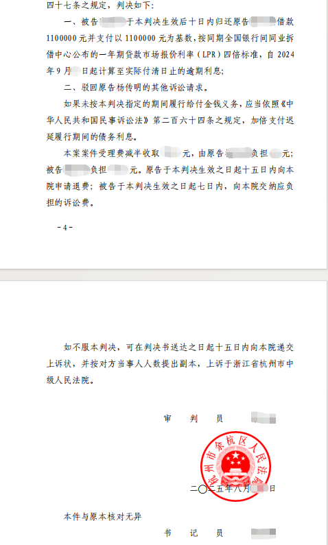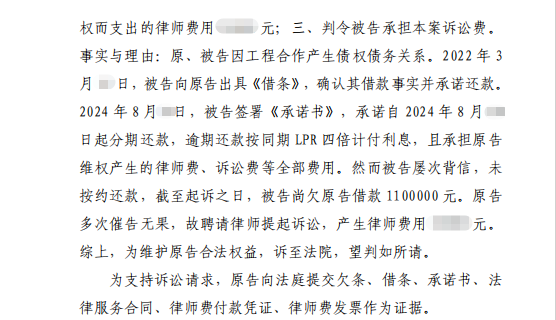 因被告未按约还款,截至2025年5月起诉时,尚欠110万元本金。原告诉至法院,要求偿还本金110万元、逾期利息、律师费及诉讼费等维权费用,并提交相关凭证为证。法院经审理,支持原告关于110万元本金及按同期LPR四倍计算逾期利息及合理维权费用的诉求。