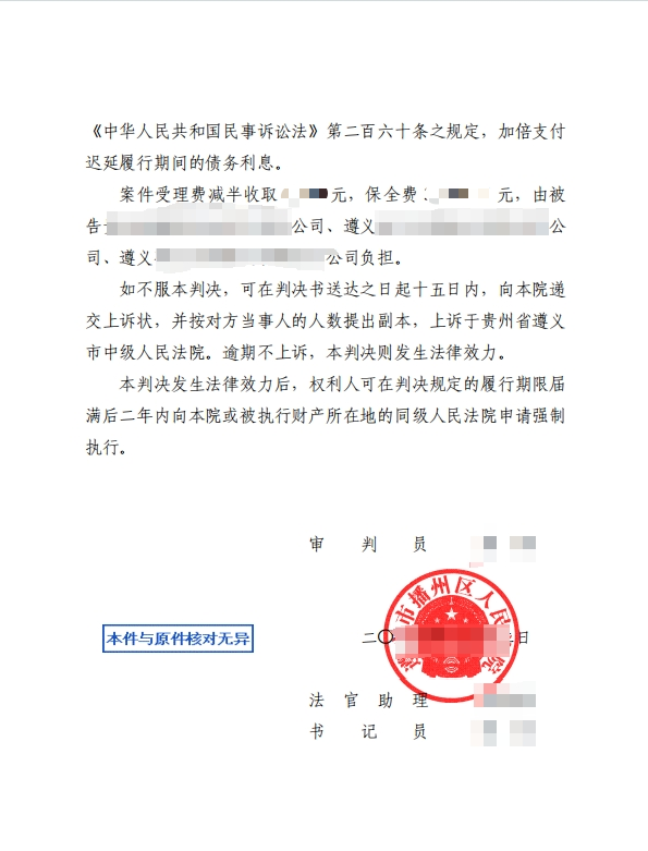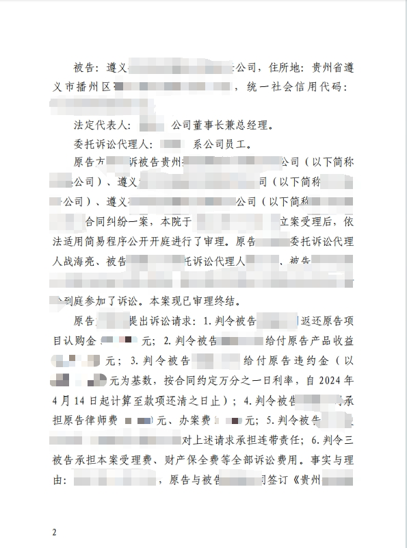 由本所战海亮律师承办的刘某诉贵州A公司、B公司、C公司合同纠纷一案,经贵州省遵义市播州区人民法院审理,最终判决支持原告刘某的主要诉讼请求,三被告需共同返还认购金50万元、支付剩余收益及违约金,并承担连带清偿责任。该案涉及民间融资、担保责任、违约金计算等多个典型法律问题,对类似投资纠纷的处理具有参考价值。
